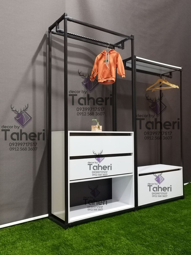 ترکیب فلز و mdf نمایی جذاب و شیک بع ارمغان آورده است، رگالی جا دار و چشم نواز که شامل ۳ کشو و یک باکس زیباست، همچنین دو لاین آویز برای لباسهای کوتاه و لباسهای بلند بصورت جداگانه طراحی شده که ظاهری جذابتر را شاهد باشیم.